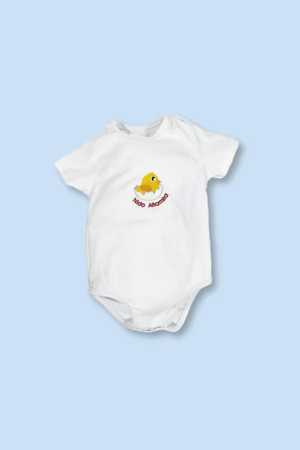 Body blanco con logo Nido Altamira. Esta prenda está elaborada en algodón el cual proporciona suavidad y frescura ideal para la piel del bebe. Cuenta con botones de presión en entrepierna para mayor facilidad al vestir.